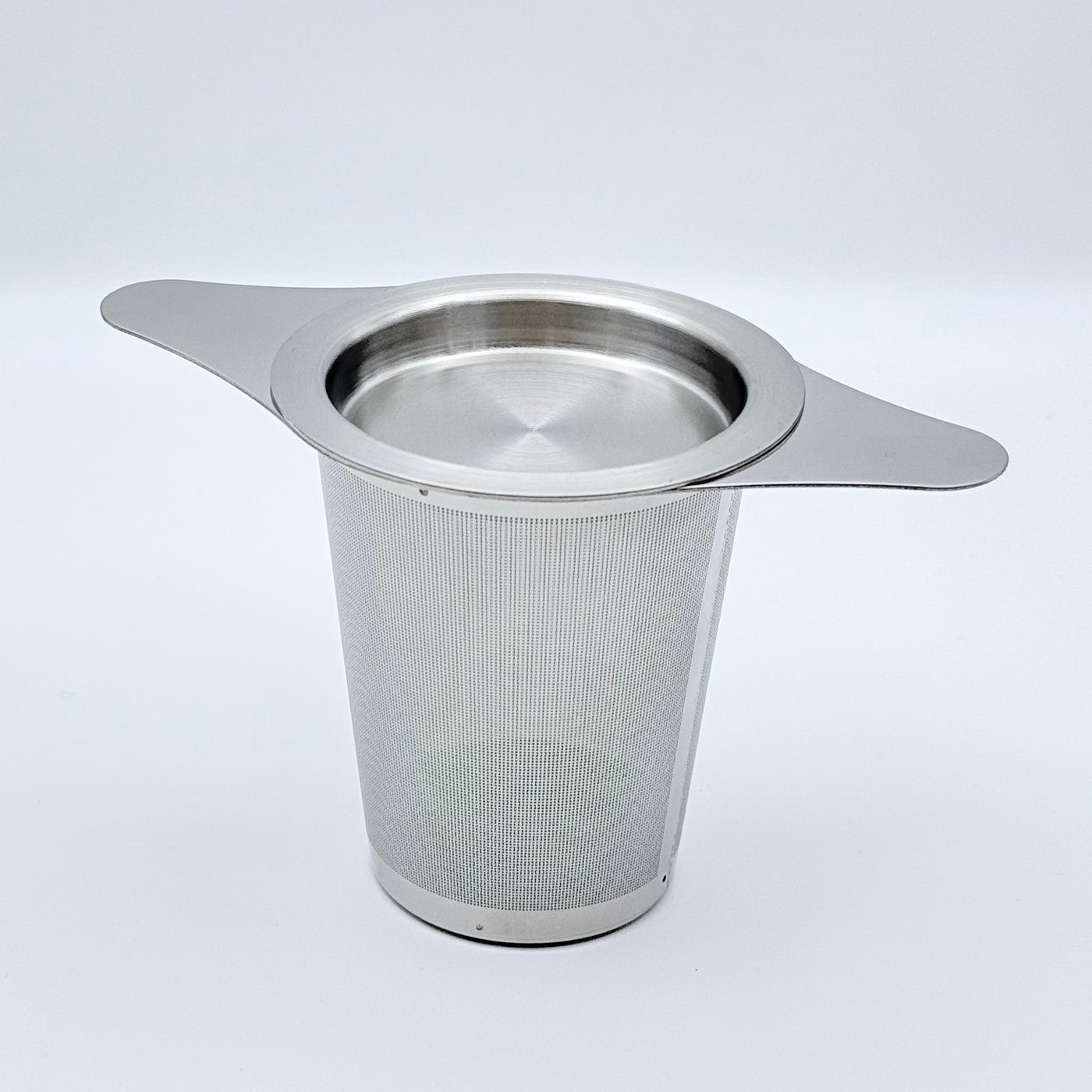This fine-mesh stainless steel tea infuser features a double-handle tapered basket that fits easily into teapots or wide mugs. The included lid keeps heat in while steeping, and doubles as a dish to rest the tea strainer after use.