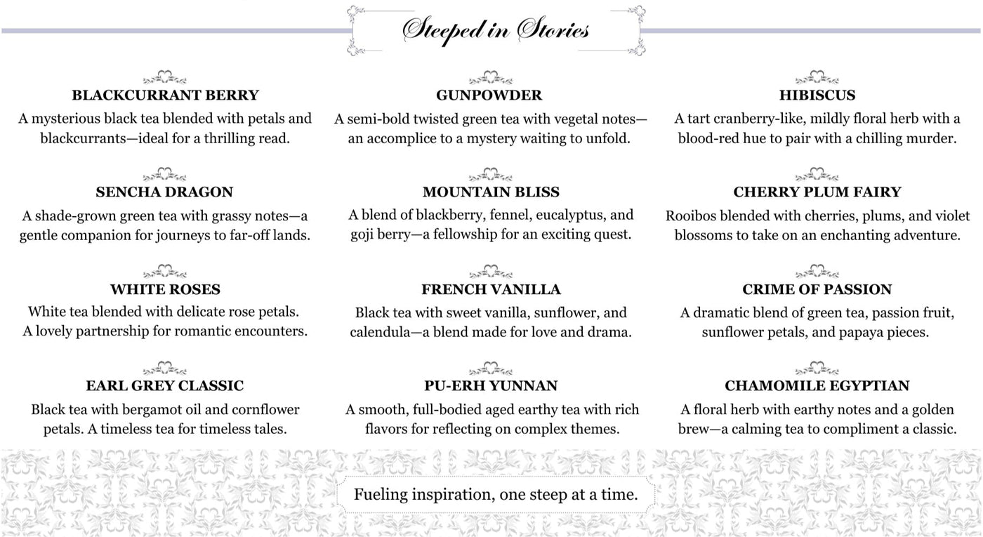 Cozy up with a good book and an assortment of teas perfectly paired with every page turned. This set includes teas inspired by some of the most popular book genres including: Mystery, Fantasy/ Adventure, Romance/ Drama, and Classics.